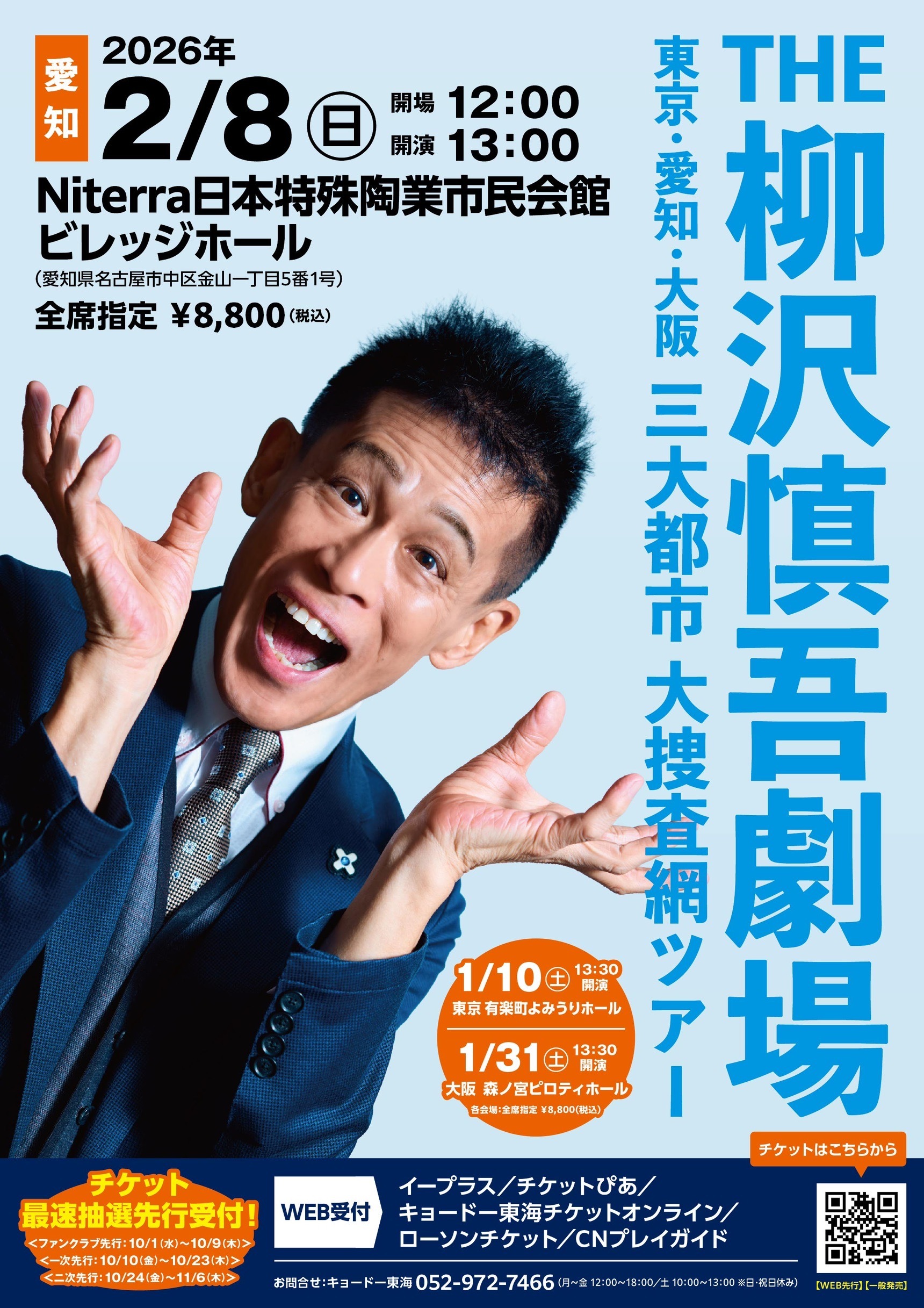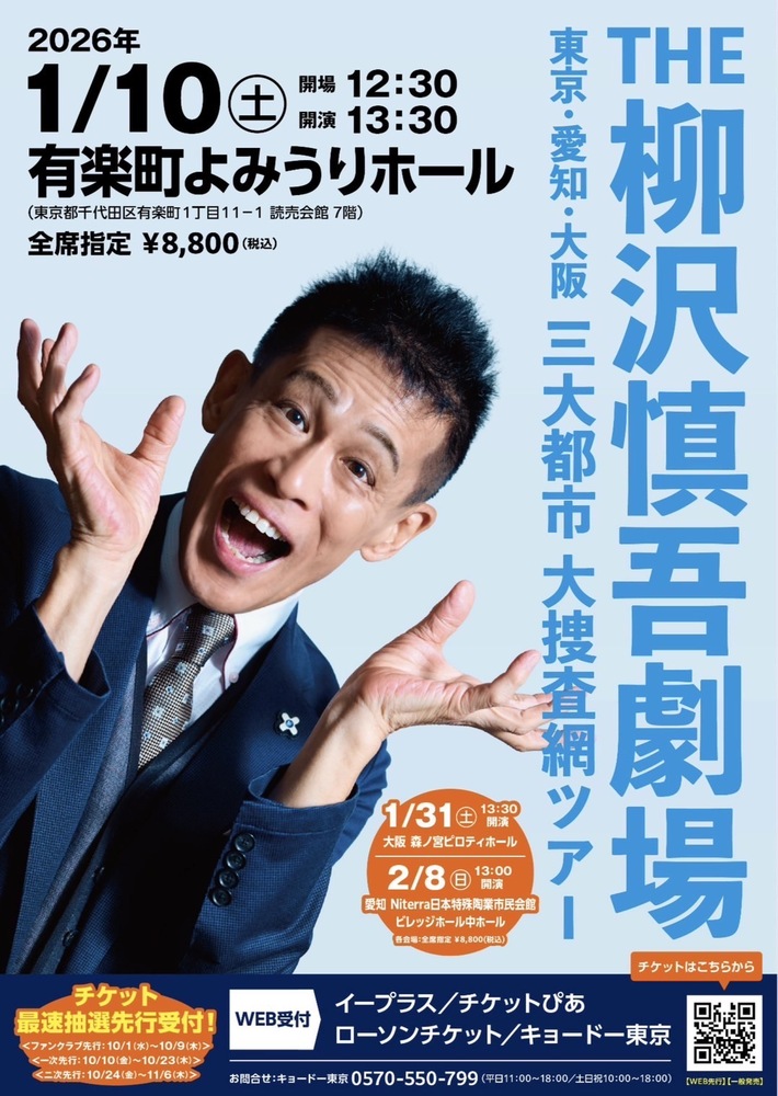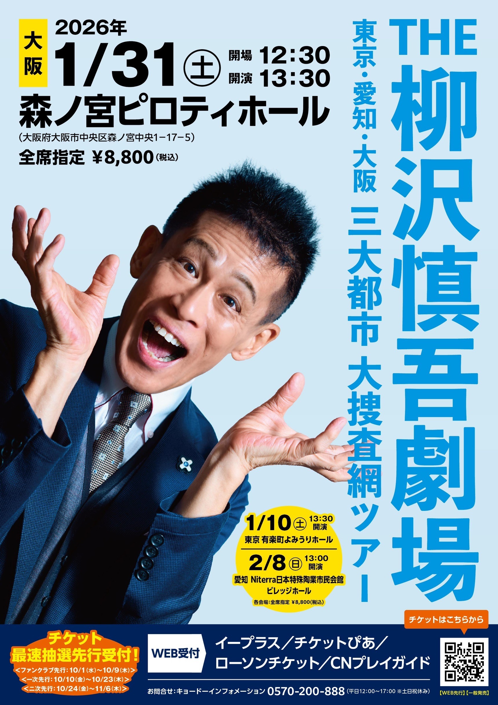 「THE 柳沢慎吾劇場」東京・愛知・大阪 三大都市 大捜査網ツアー フライヤー公開!! ニュース 柳沢慎吾オフィシャルファンクラブ “栁澤商店”(2025年10月1日開店) 2025/09/29 10:53 フォロー ツアー詳細はこちら!! URLをコピーする 報告する